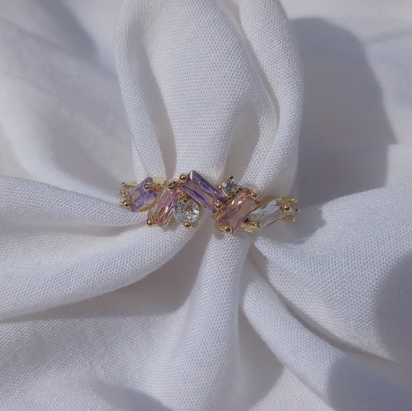 Anillo de cobre enchapado en oro con zirconitas de distintos colores. Los colores pueden variar por la resolución de la pantalla.